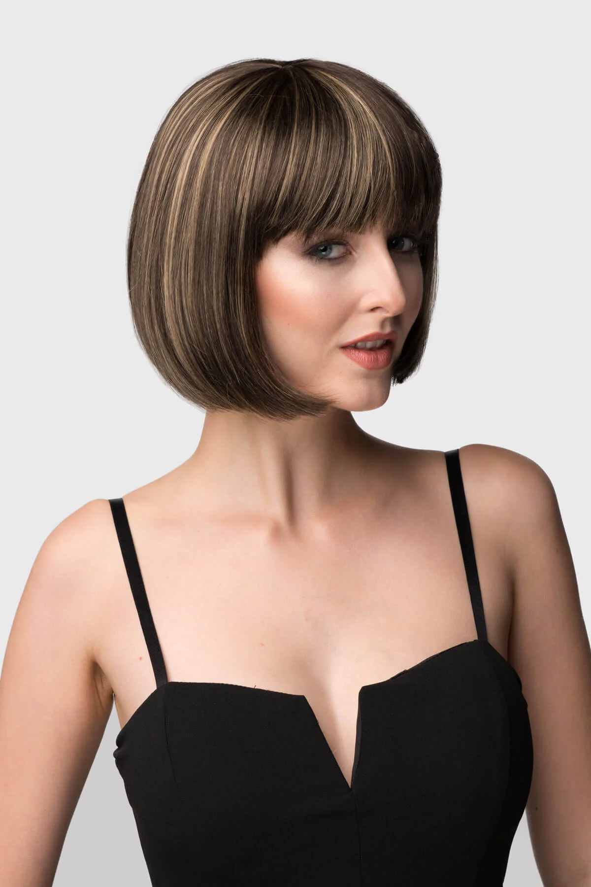 A gorgeous, modern take on the classic bob: Chestnut brown with blonde highlights and a flattering bangs/fringe; its blunt cut layers fall down to the chin and are gently curled inwards in a rounded shape that frames the face and gives a bounce to the movement.