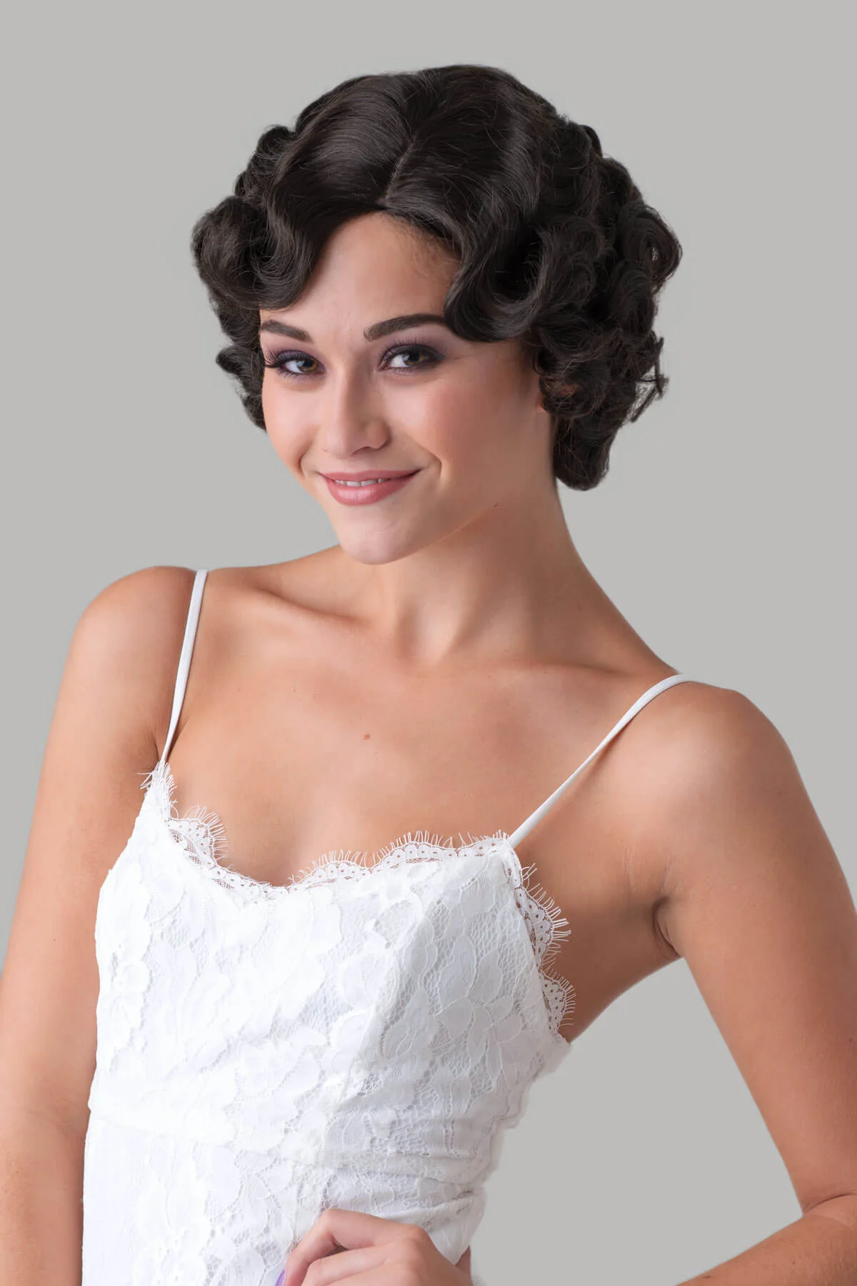 Brown wig, short retro style with finger waves: Cecelia