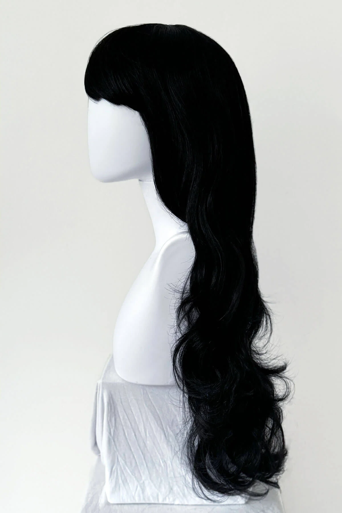 This gorgeous long black wig, Eloise, channels vintage rockabilly charm with its iconic straight fringe. Luxuriant waves tumble down to create a striking, glamorous silhouette that turns heads wherever you go. Perfect for adding a playful, retro vibe to your look, Eloise lets you embrace timeless sophistication and fun with every wear. Whether it’s a special event or everyday glam, this wig brings bold style and effortless elegance together in perfect harmony.