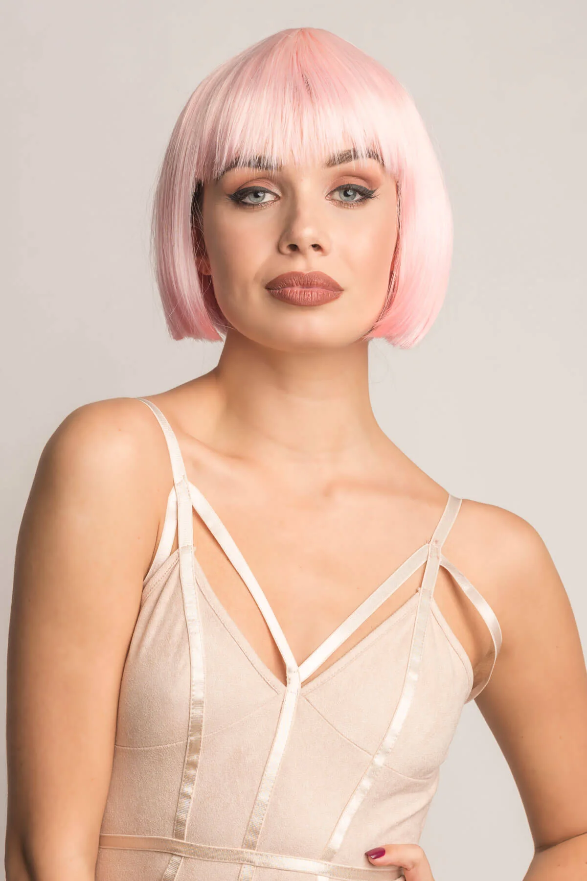 This short pink bob wig, Louisa, offers a fresh and playful twist on the timeless bob style. Featuring a flattering fringe and blunt cut layers that fall just to the chin, its gentle inward curls create a rounded shape that beautifully frames your face. The ombre effect, blending pale pink with platinum, adds a fun, vibrant dimension to your look. Lightweight and easy to style, Louisa brings a lively bounce to your hair movement, perfect for anyone wanting to brighten their day with a splash of colour and charm.
