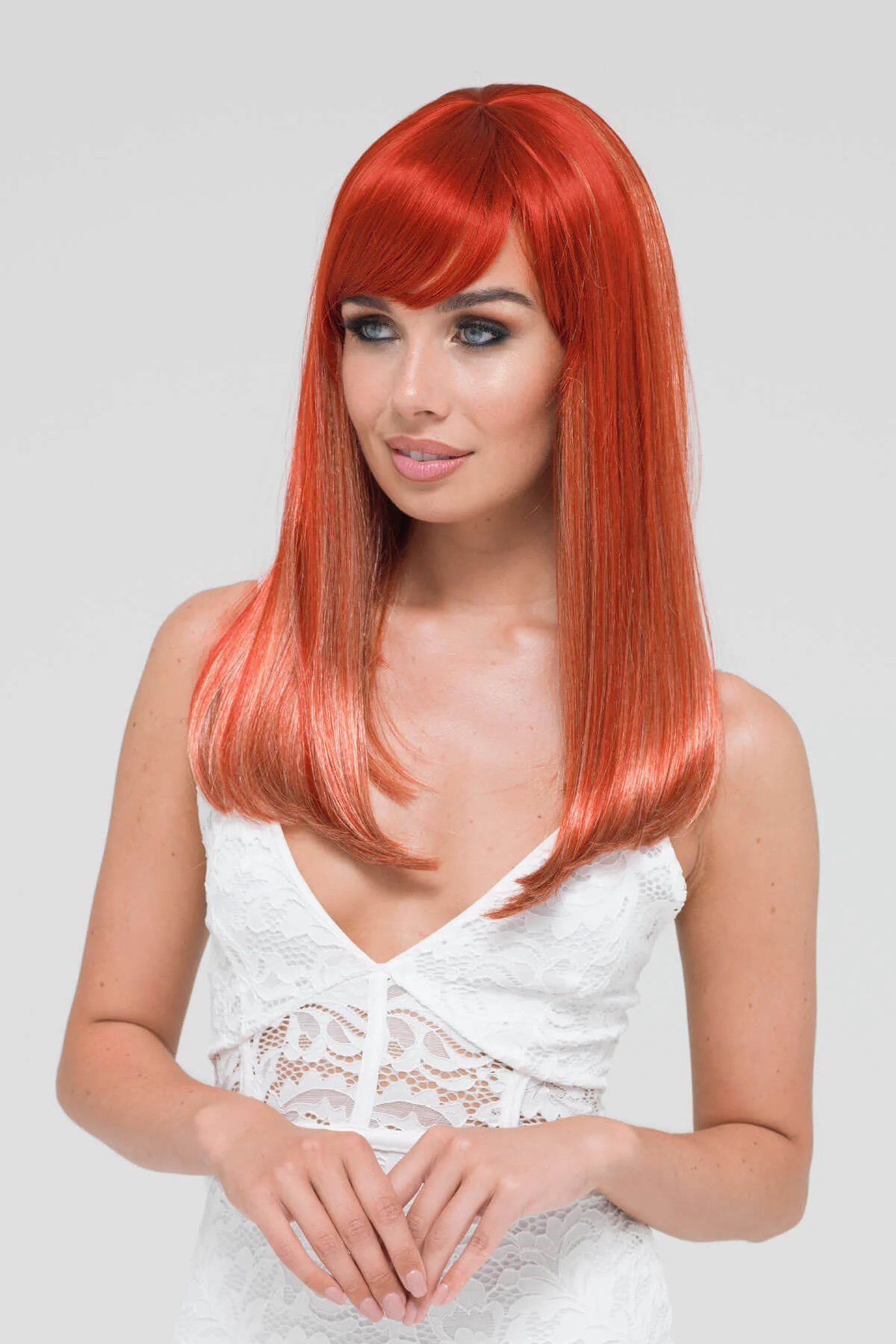 This vibrant copper red and golden blonde wig, Mathilda, adds a splash of fiery charm to your look. Its long, silky strands perfectly frame your face, drawing attention to your features with a warm glow. The full, bluntly chopped fringe sits right along your eyebrows for a bold, playful edge that’s impossible to ignore. Embrace a new style adventure with this striking wig that promises both comfort and captivating color wherever you go.